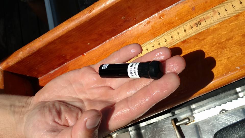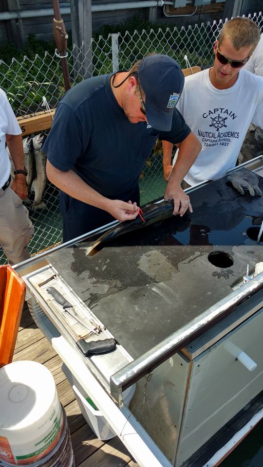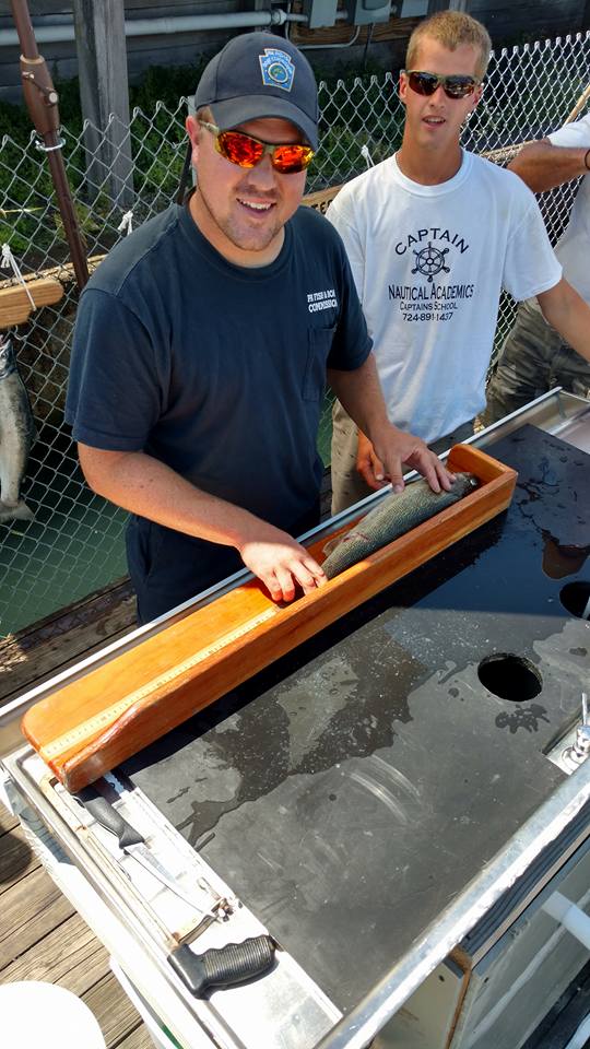 PA Fish Commission inspects a tagged fish from Lake Erie.