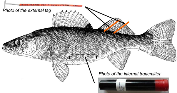 floy tag sticking out of the walleye's back. A sharp eye will see the tiny
